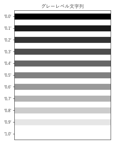 '#abcd'グレーレベル文字列 '0.0':黒 ~ '1.0':白 の float値の文字列 '0.5' 色名の省略形 (1文字)