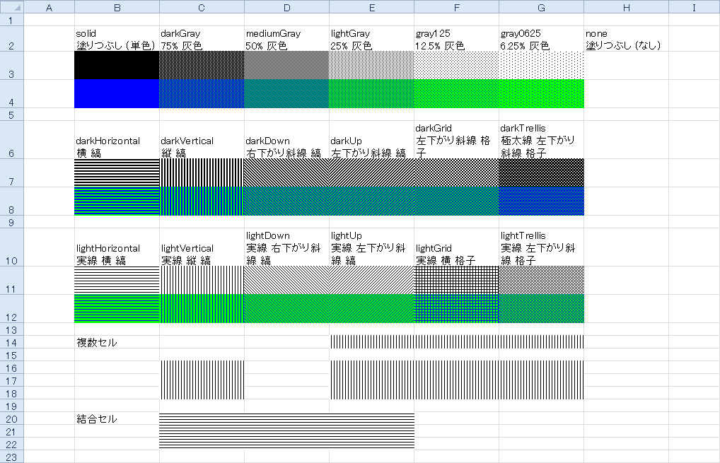 | 塗りつぶしパターンの種類 patternType・fill_type | 説明 | パターンの色 fgcolor start_color | 背景色 bgcolor end_color | |