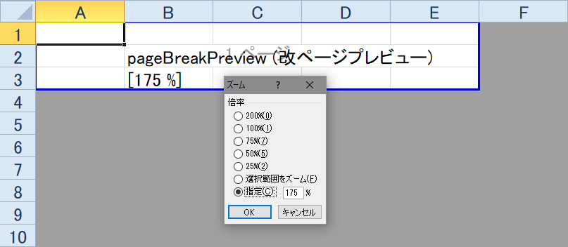 | zoomScaleSheetLayoutView | None:自動 int (0:自動 / 10 ~ 400:10% ~ 400%) | ズーム倍率 (改ページプレビュー) |